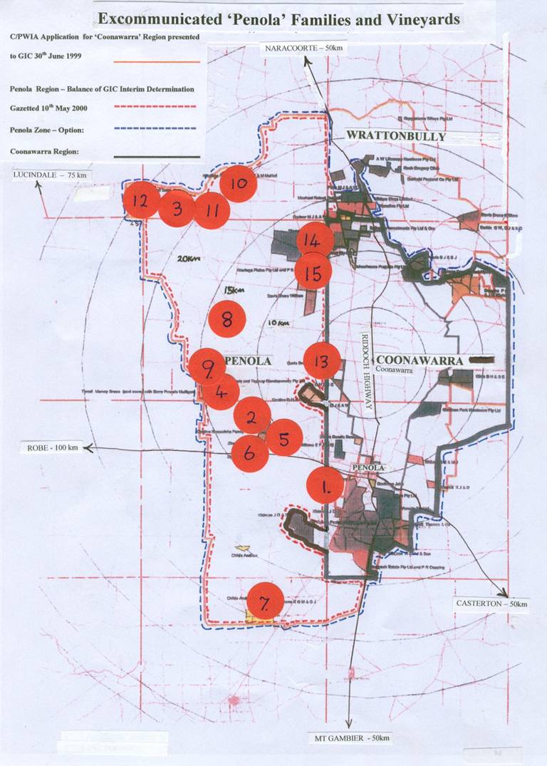 The Penola wine district: "Penola Community" vineyards are pklanted throughout the district over an area of approximately 45km (North--South) x 12km (East--West). (See Map below)